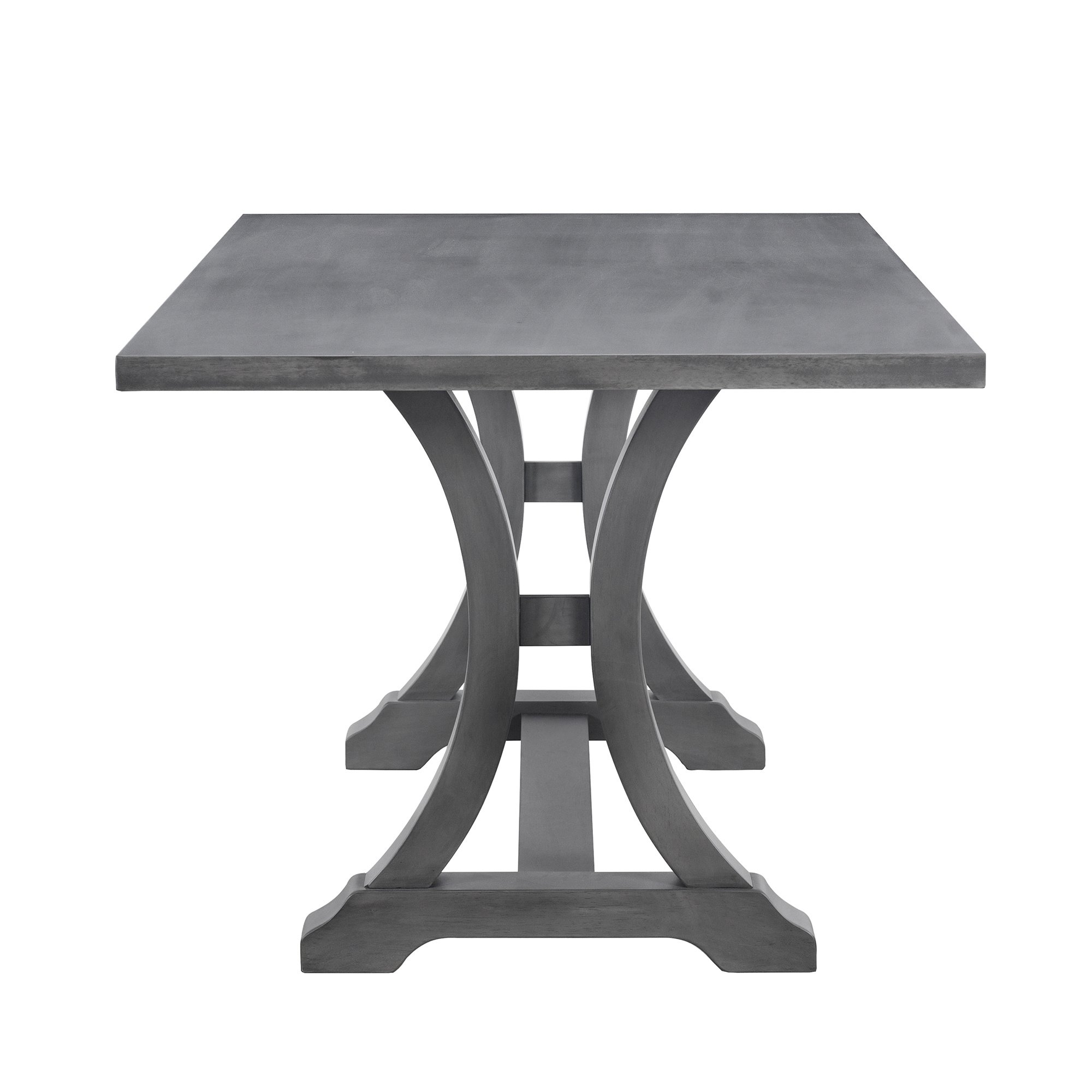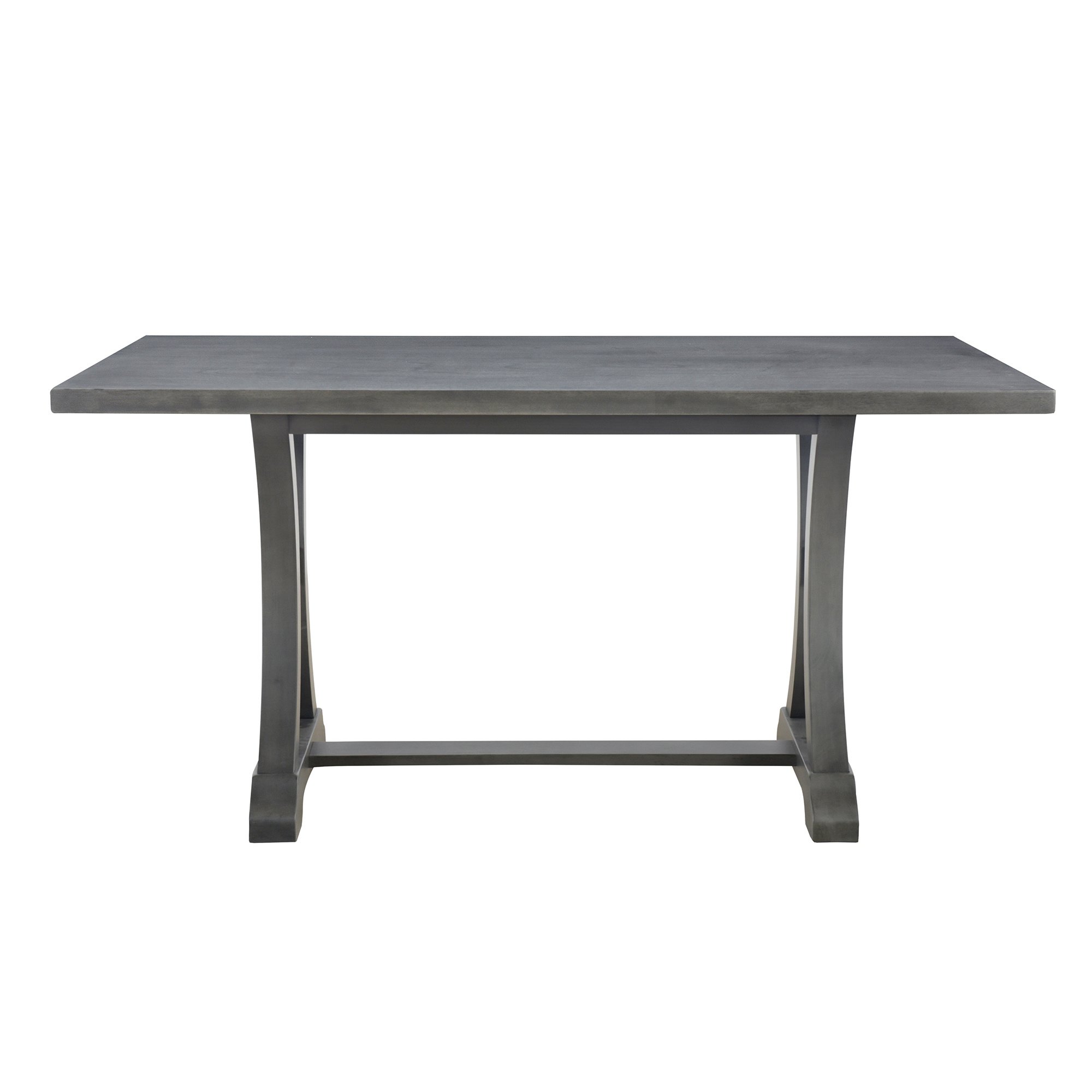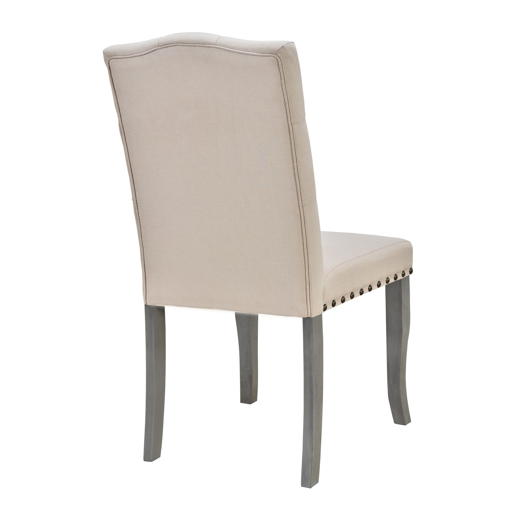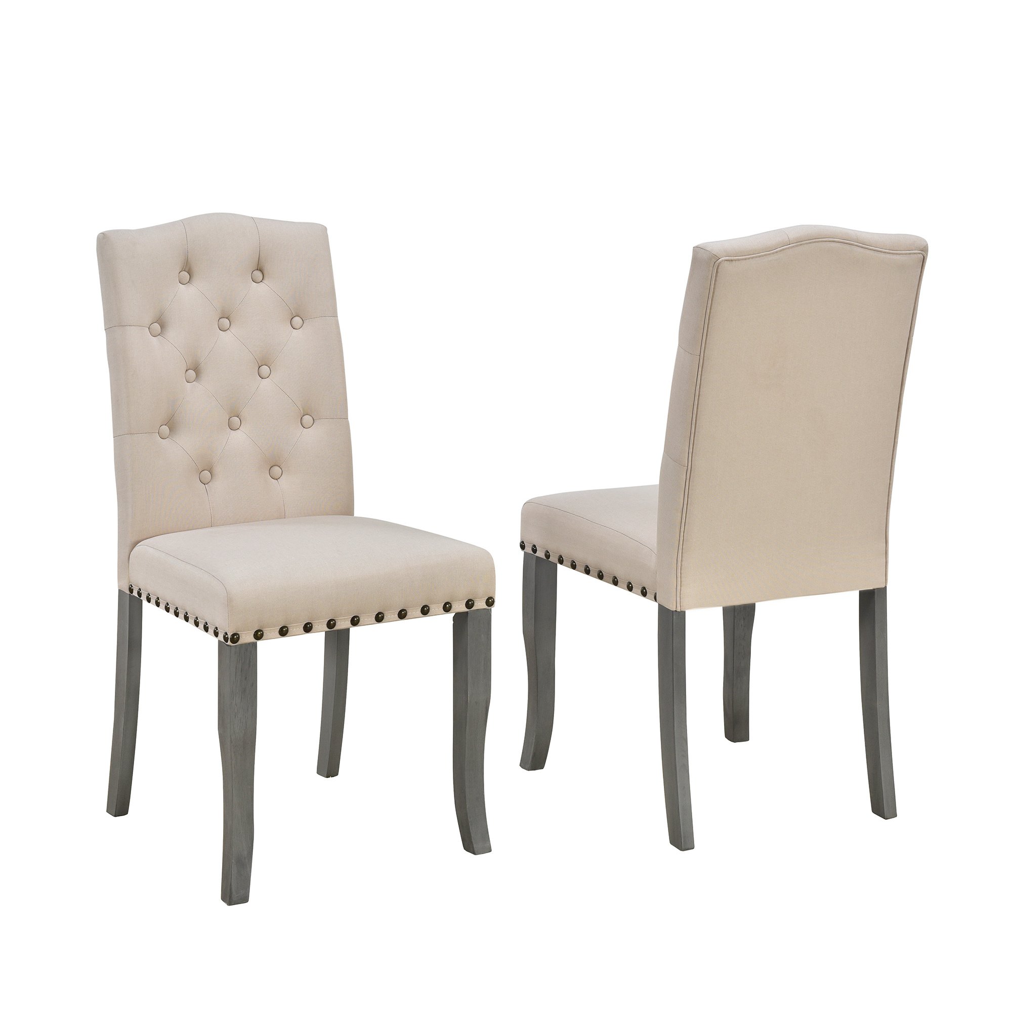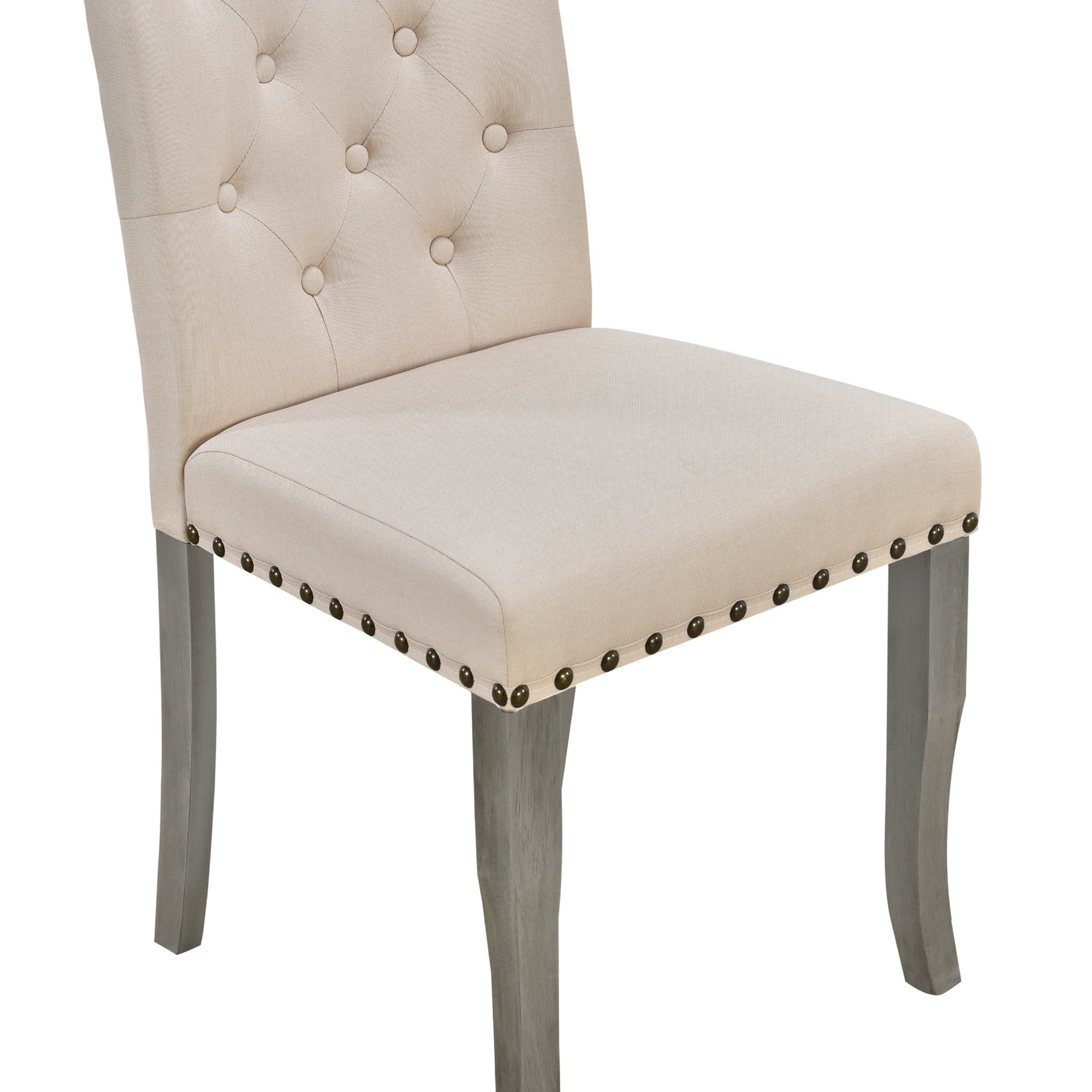 The curved trestle-shaped table legs demonstrate a unique aesthetic feeling, showing the soft and elegant effect of American style. The backrests of the chairs are ornamented with tufted buttons that form an elegant argyle pattern. With nailhead decoration around the side of the upholstered chair cushions, this rustic dining table set makes an impact on the modern and contemporary style. These delicate details can make the dining set less homogeneous and more distinctive.